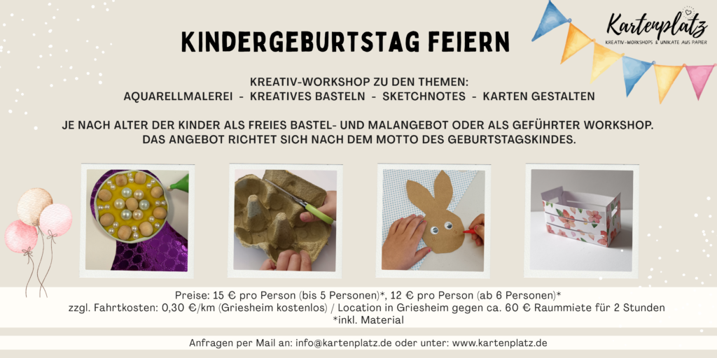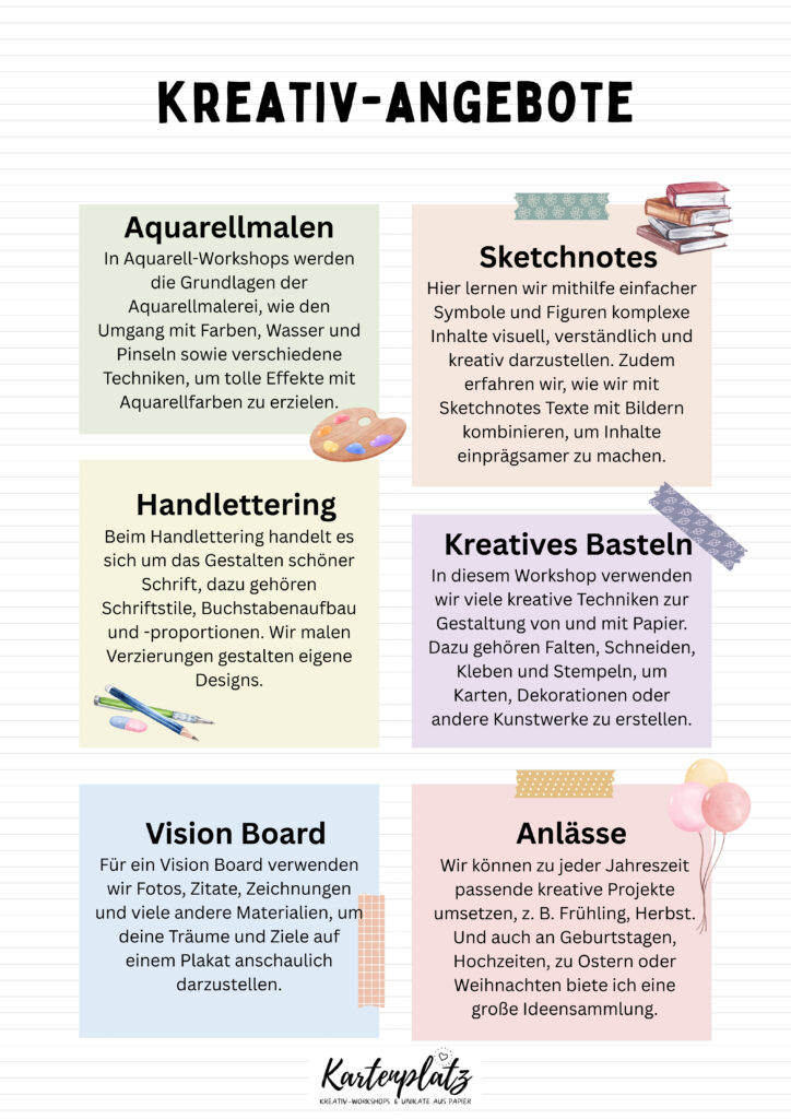 Zu den Themen Aquarellmalerei, Kartenbasteln, Handlettering, Sketchnotes und Vision Board bietet Kartenplatz für Interessierte Kreativ-Workshops als Einzelstunden und Gruppenveranstaltungen sowie Firmenevents an.