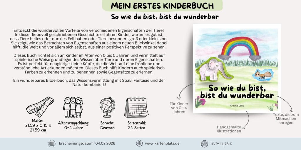 Dieses Buch richtet sich an Kinder im Alter von 0 bis 5 Jahren und vermittelt auf spielerische Weise grundlegendes Wissen über Tiere und deren Eigenschaften. Es ist perfekt für neugierige kleine Köpfe, die die Welt auf eine fröhliche und verständliche Art erkunden möchten. Dieses Buch hilft Kindern auch spielerisch Farben zu erkennen und zu benennen sowie Gegensätze zu erlernen.